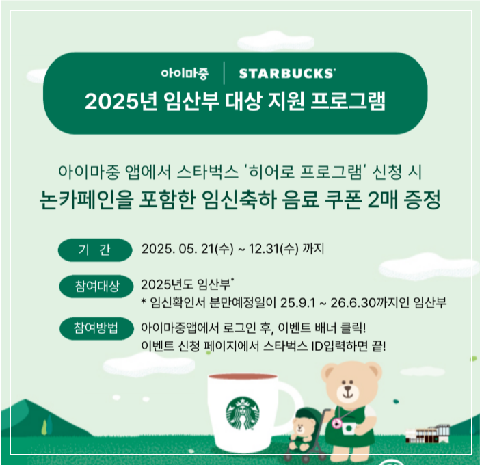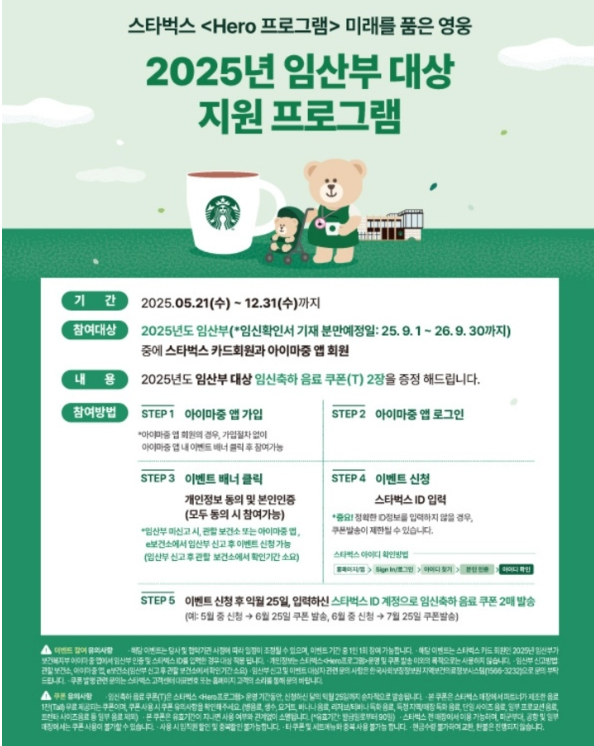 이렇게 오늘은 스타벅스 <히어로 프로그램>으로 이루어진 '2025년 임산부 대상 지원 프로그램- 임산부 무료 음료 쿠폰 제공' 신청방법과 신청대상에 대해 알아보았어요.
