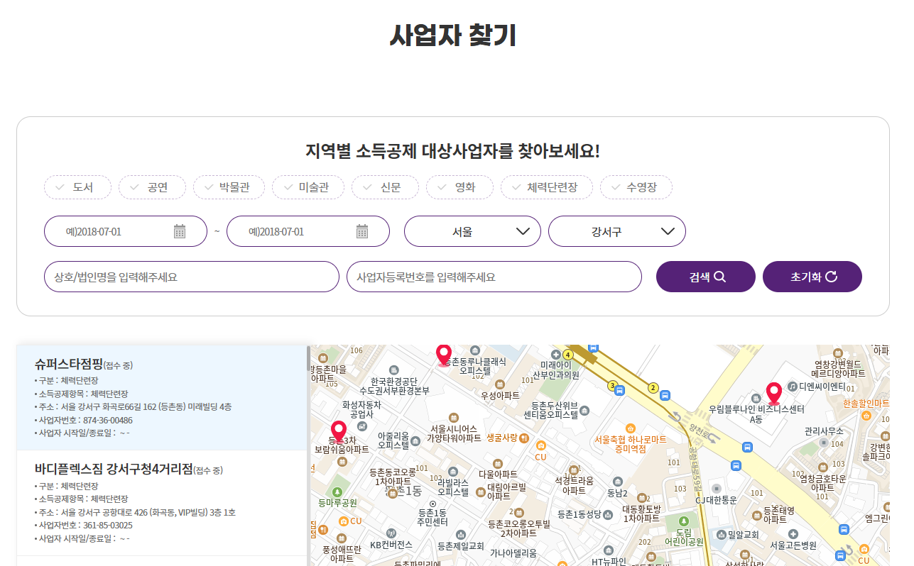 지역별 소득공제 대상사업자 검색