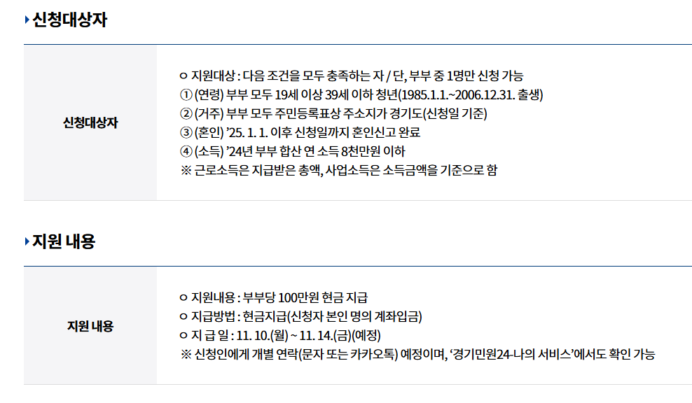 | 자격 요건 | 85~06년생, 혼인신고 2025.1.1 이후, 소득 8,000만 원 이하, 경기도 거주 |