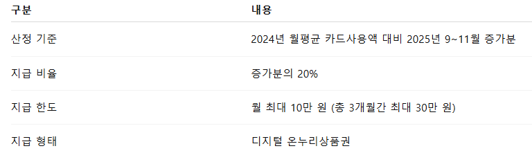 간단히 말해, 올해(2024년) 카드 사용 실적 대비 2025년 9~11월 소비가 늘어난 금액의 일부를 다시 돌려주는 제도인데요.