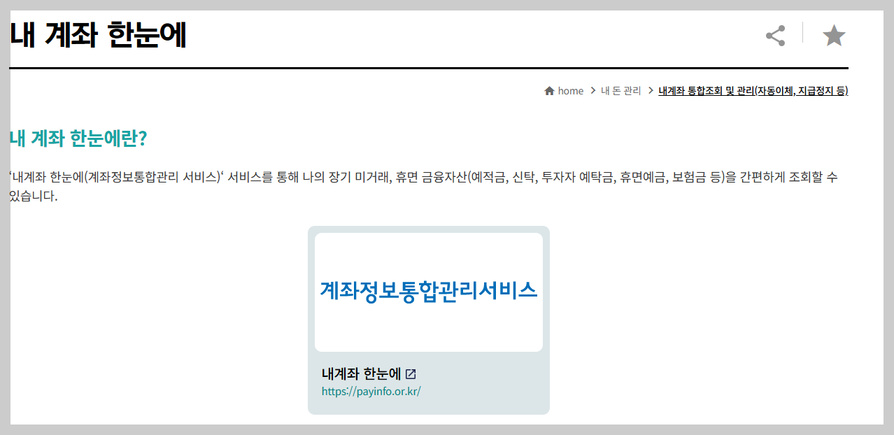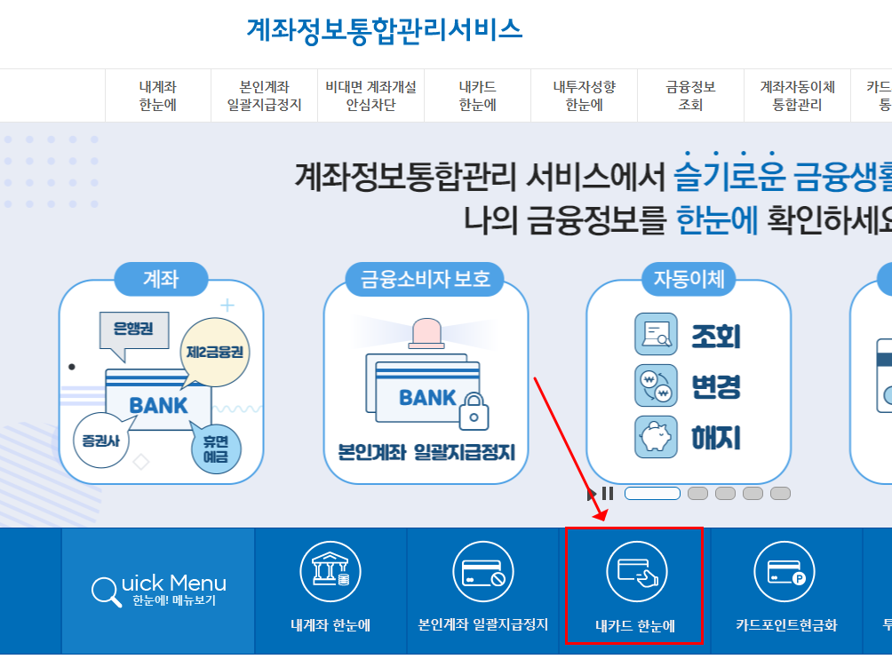 계좌정보통합관리 홈페이지 - 내 카드 한눈에