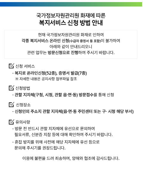 이번 사태로 복지로 온라인 신청 52종, 증명서 7종 등 일부 기능이 중단되었습니다.