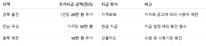 지역 추가 사례(예시): 경북 울진 20만원(지역화폐), 전남 곡성 가구당 50만원(현금), 충북 제천 10만원(선불카드) 등.